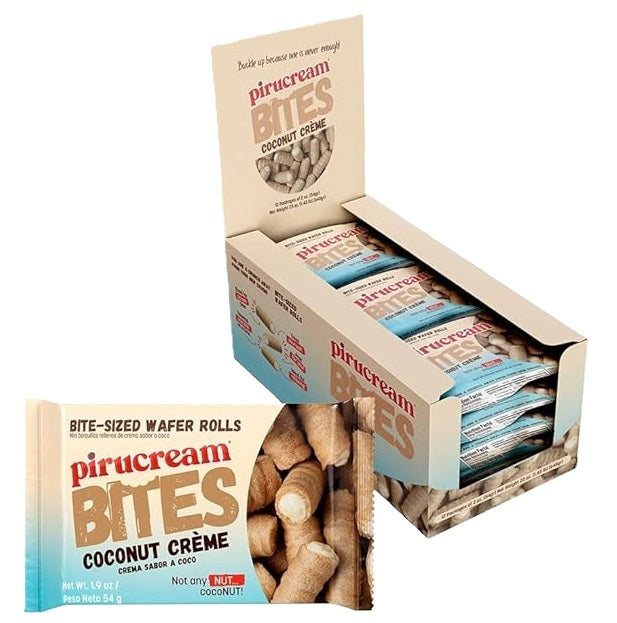 Los Pirucream Bites de coco combinan la textura crujiente del barquillo con una crema de coco suave y aromática. Un snack tropical y delicioso, perfecto para el día a día.
