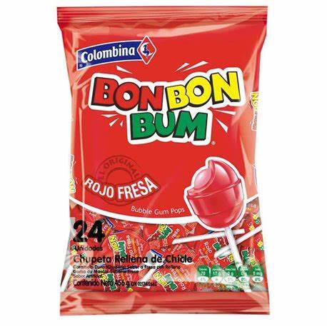 El Bon Bon Bum Fresa de Colombina es una paleta con centro de chicle que combina el sabor jugoso de la fresa con la diversión de una goma de mascar.