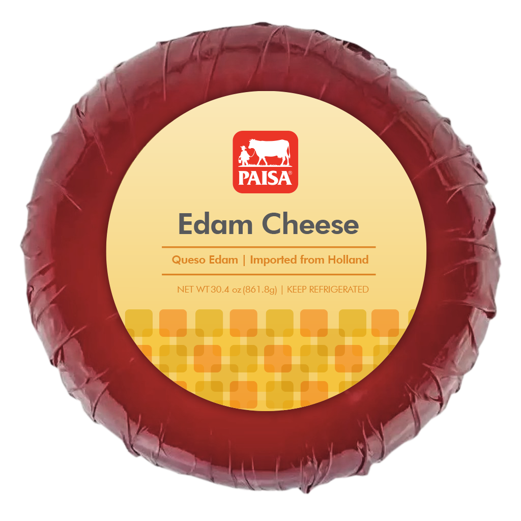 La Bola de Queso Edam Importado de PAISA tiene un interior firme y sabor suave con un ligero toque dulce. Perfecta para sándwiches, picadas o fondue.